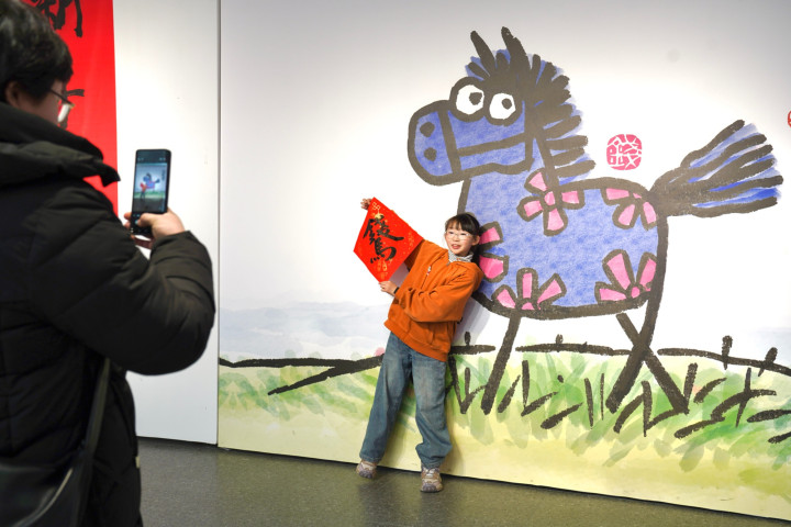 非遗体验区里,熏样剪纸非遗传承人孙立荣的摊位前格外热闹,她现场展示着这项传统技艺,吸引了众多市民游客驻足观看。“木板铺纸、喷水擦拭、煤油灯熏制,熏的时候速度要刚刚好,才能做出黑白分明的底稿。”孙立荣一边讲解熏样剪纸的制作步骤,一边分享着儿时跟着姥姥学手艺的故事。她表示,过年剪生肖、贴福字是老辈传下的年俗,马年就剪骏马配福字,这些剪纸贴在窗上、车上、冰箱上,都是新春的美好祝福。