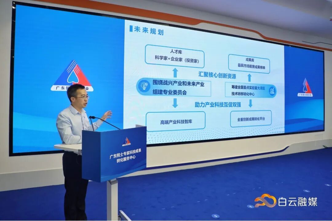 该中心由广东院士联合会设立,依托该服务中心,在科技与产业、科学家与企业家之间,架设合作桥梁,让院士专家“找到”企业家,让企业家“找到”技术、成果、人才,促进产业链、创新链、金融链深度融合,打通实验室成果到生产线的“最后一公里”。